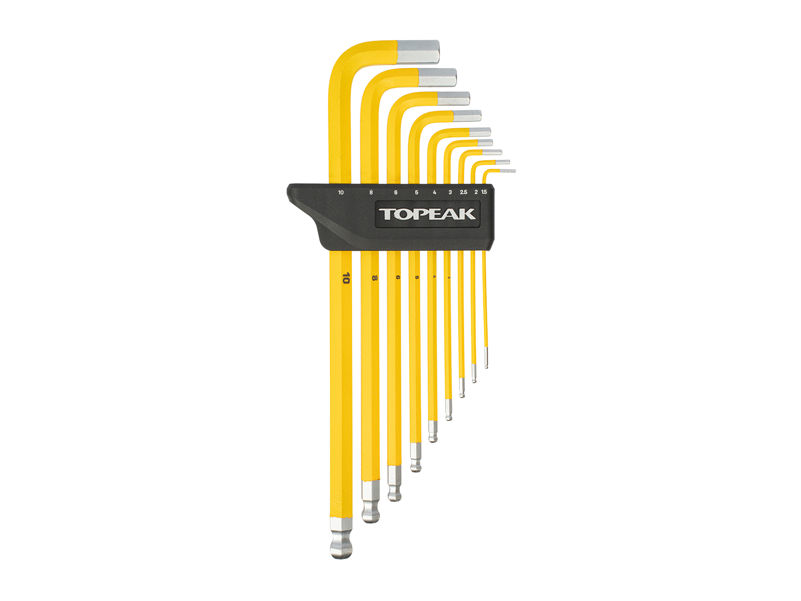 Das Topeak Duo Hex Wrench Set DX deckt alle gängigen Größen von 1,5 bis 10 mm ab. Dazu deckt das Topeak Torx® Wrench Set DX alle Größen von T10 bis T50 ab. Die L-Form ermöglicht sowohl kraftvolles Anziehen als auch präzises Arbeiten in engen Bereichen. Die Schlüssel sind aus hochwertigem Chrom-Vanadium-Stahl gefertigt und behalten auch nach Jahren intensiver Nutzung ihre perfekte Passform.