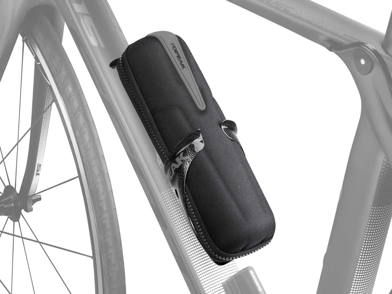 Im Flaschenhalter verstaubare Tasche mit größerem Volumen und abnehmbarem Organizer für Mini-Tool, 26"-29"/700C-Schlauch, Reifenheber, Minipumpe bis 22 cm Länge oder CO2-Notfallset und zusätzlich benötigtes Werkzeug.