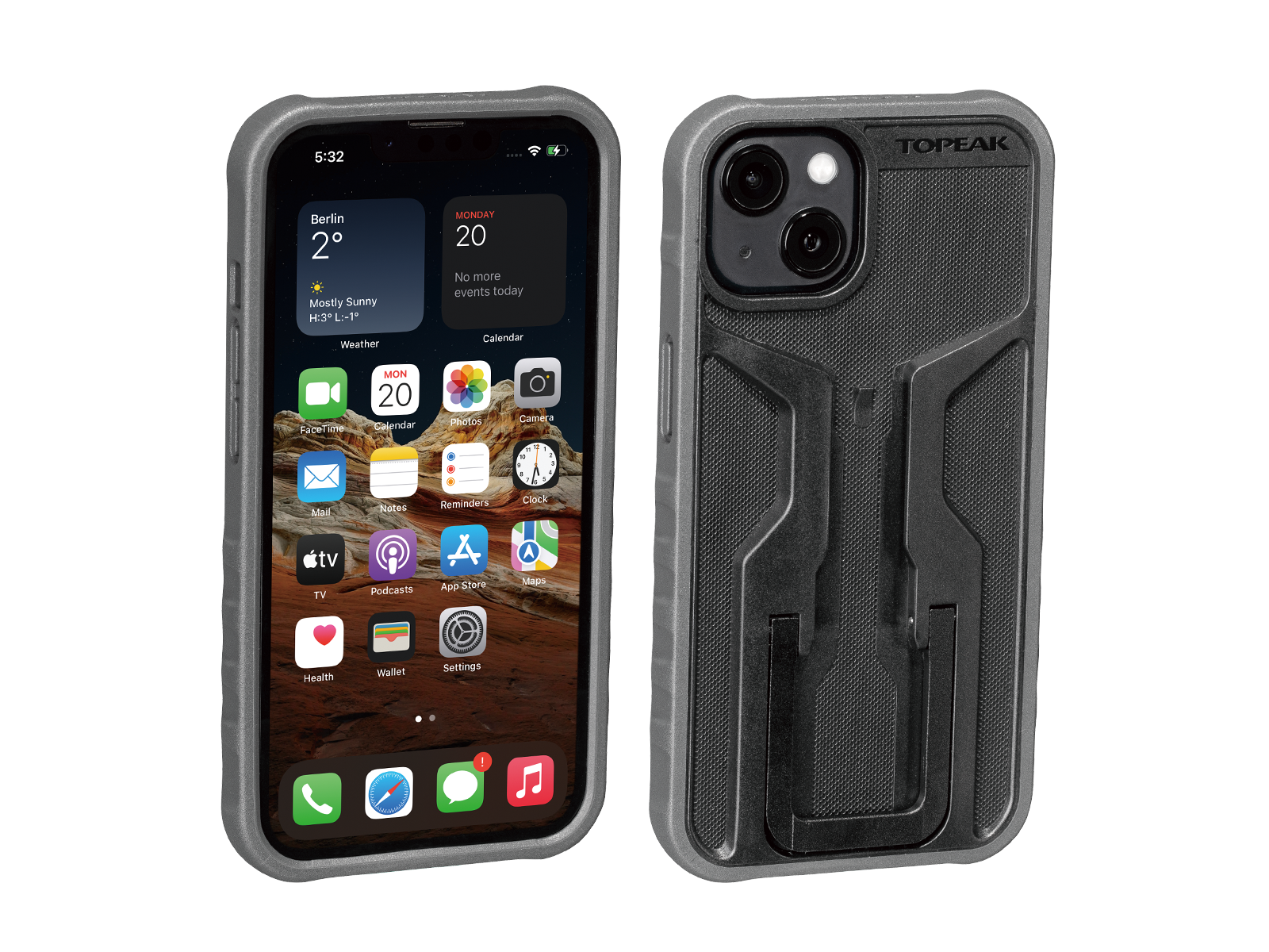 Das RideCase® für das iPhone 13 trumpft mit einem kratz und rutschfesten Dual-Density-Exoskelett auf, dessen verstärkte Ecken optimalen Schlag- und Aufprallschutz gewähren. Durch die einzigartige, winkelverstellbare Halterung (optional erhältlich) lässt sich das RideCase® sowohl in der Porträt- als auch in der Landschaftsansicht nutzen und in Sekundenschnelle befestigen sowie entfernen. Beide Ansichten lassen sich dank des integrierten Flipstands auch abseits des Bikes nutzen. Nicht kompatibel mit kabellosem Aufladen*.