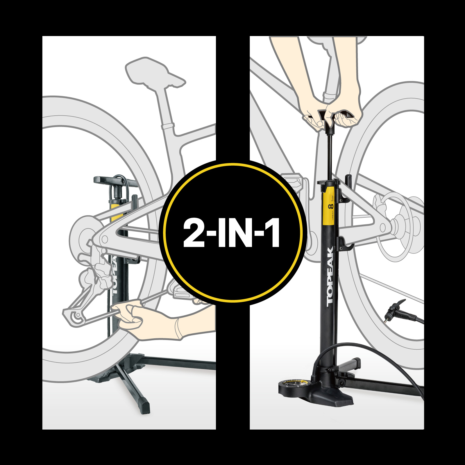 | Kopf | • TwinHead® mit langem Schlauch • Passend für Presta-, Schrader- & Dunlop-Ventile sowie Topeak TurboFlow Valve Adapter / Kits |