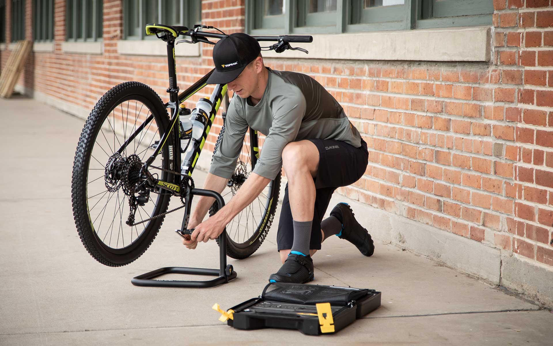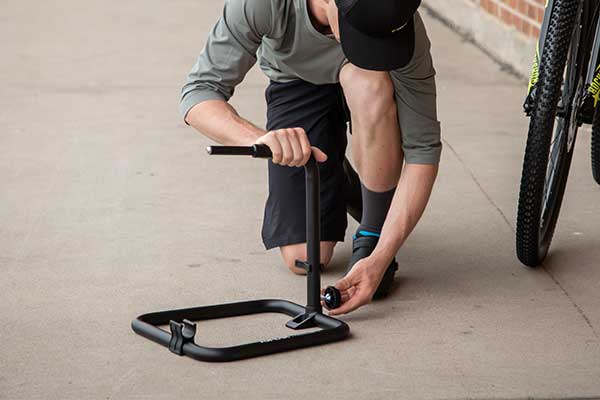 FlashStand MX lifts the rear wheel off the ground for adjust drive train, brakes and display.