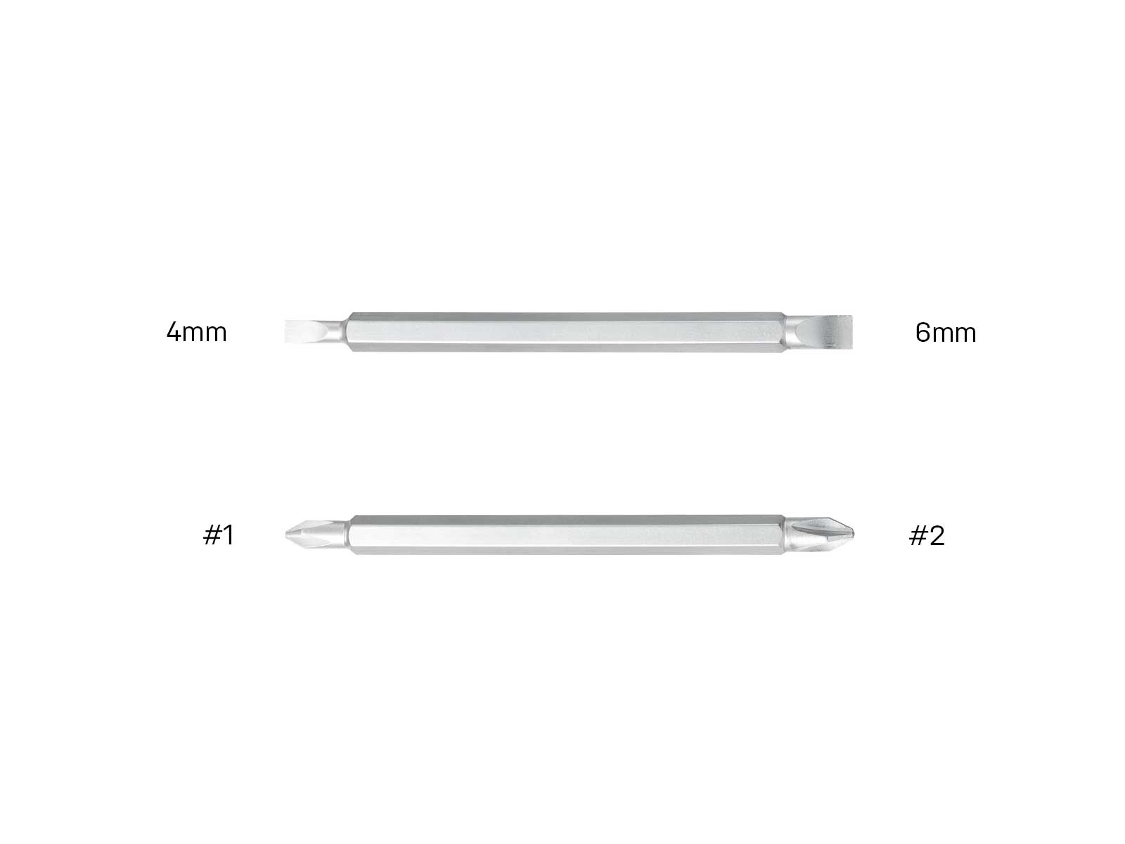 Includes one 4/6mm flat head screw driver and one #1/ #2 Phillips driver.