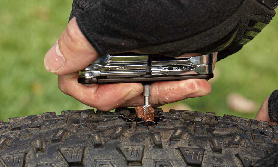 12 function, pro-quality, precision mini tool with integrated tubeless tire repair functions. Tubeless repair tools conceal within the folding tool body. Integrated tubeless tire repair tools snap into the tool body for easy handling when repairing your tire. Perfect for any road or trailside repair.