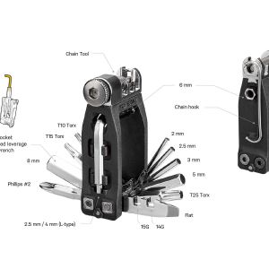 | Tools | • 2 / 2.5 / 3 / 4 (L-type) / 5 / 8 mm Allen wrenches • 6 mm hex tool bit • T10 / T15 / T25 Torx® wrenches • #2 Phillips / flat head screw drivers • 14G / 15G spoke wrenches • CrMo steel chain tool* • chain hook |