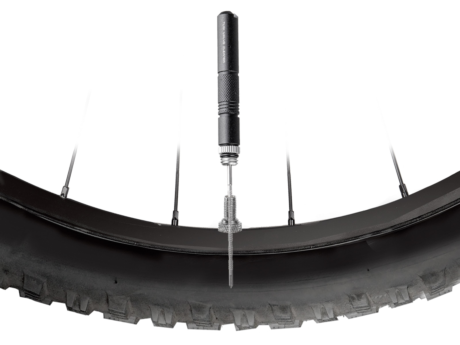 Precision CNC machined aluminum Tubi Valve Cleaner allows to remove or tighten two-piece Presta valve core and clear tire sealant clogs from valve stem for tubeless tire maintenance. Compact size easily fits in a jersey pocket or saddle, or mount with TubiPod Max for a ride.
