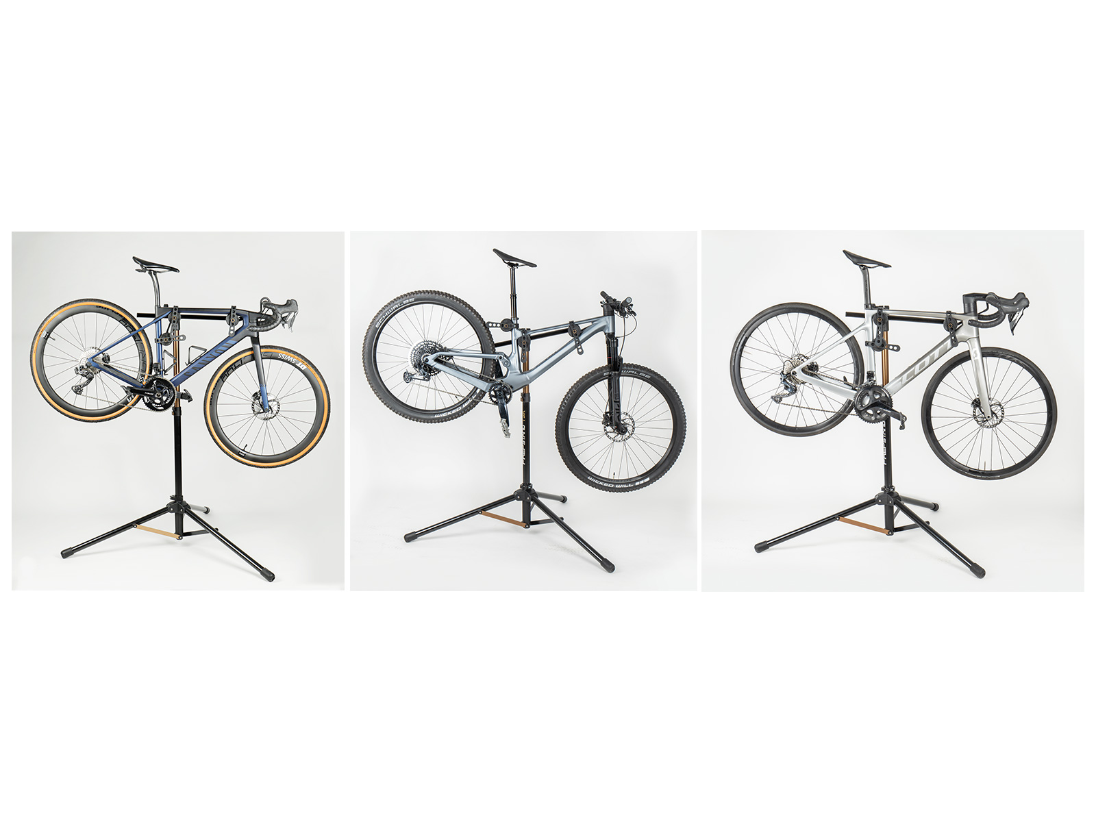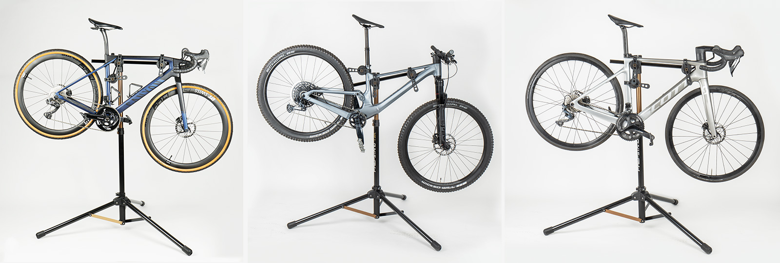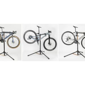 Unique adjustable 3-point anchor design workstand provides stability and eliminates damage to thin-walled and aero-shaped tubes. Three contact clamps with rubber straps are easily adjusted to fit any bicycle frame and mounts closer to the bike's center of gravity improving stability. Included handlebar stabilizer is length adjustable to fit most bikes to keep its handlebar and front wheel secure. Folds down compactly for storage.