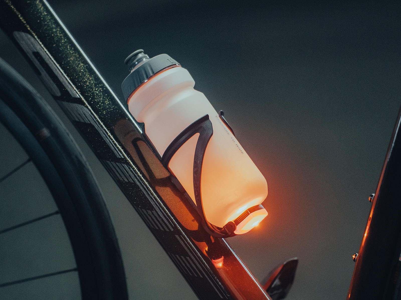 An ingenious safety light integrated with the Ninja+ bottle cage provides 360° visibility.