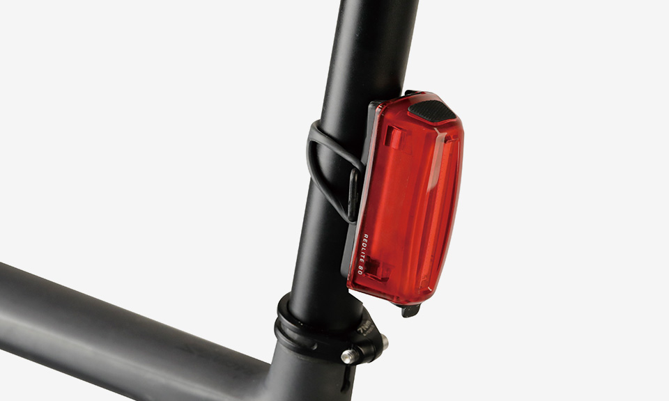 The RedLite® 80 features 80 lumens and three lighting modes. Bi-directional tool-free mounting with the included silicone strap for quick installation and removal on aero/round seatposts or seatstays.