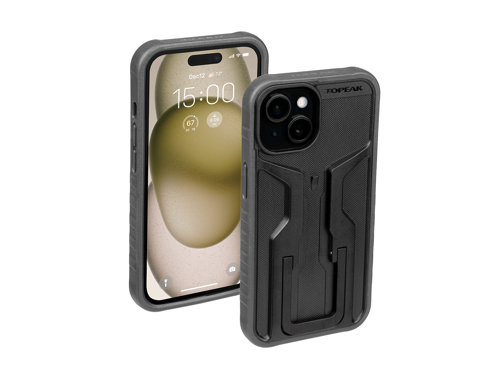 The RideCase for iPhone has a scratch-resistant, dual-density, non-slip, high-grade engineering polymer/rubber exoskeleton for shock and impact protection that holds your phone securely while on the go. Its full angle adjustment allows viewing in portrait or landscape modes and an Integrated flip stand for post-ride hands-free viewing. Compatible with Type-C charging.