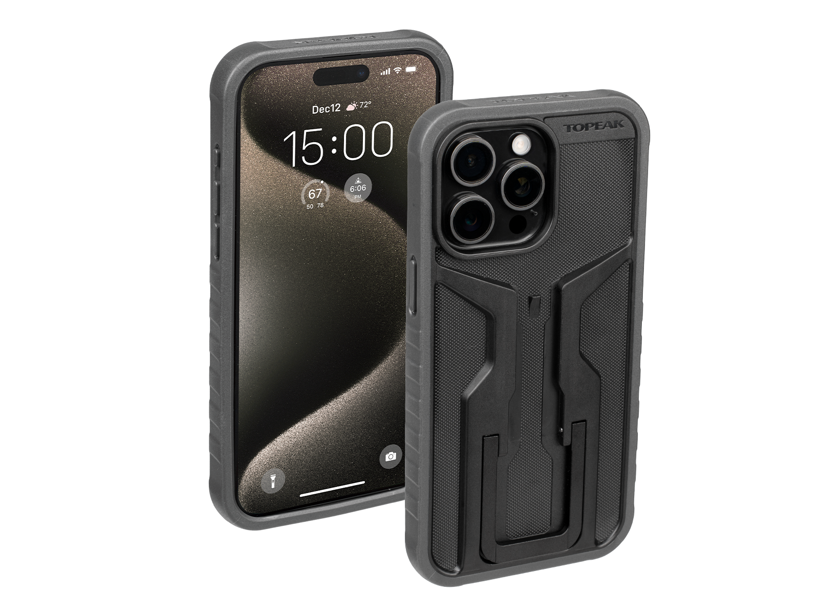 The RideCase for iPhone has a scratch-resistant, dual-density, non-slip, high-grade engineering polymer/rubber exoskeleton for shock and impact protection that holds your phone securely while on the go. Its full angle adjustment allows viewing in portrait or landscape modes and an Integrated flip stand for post-ride hands-free viewing. Compatible with Type-C charging.