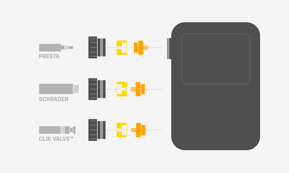 COMPATIBLE WITH PRESTA, SCHRADER, AND CLIK VALVE™