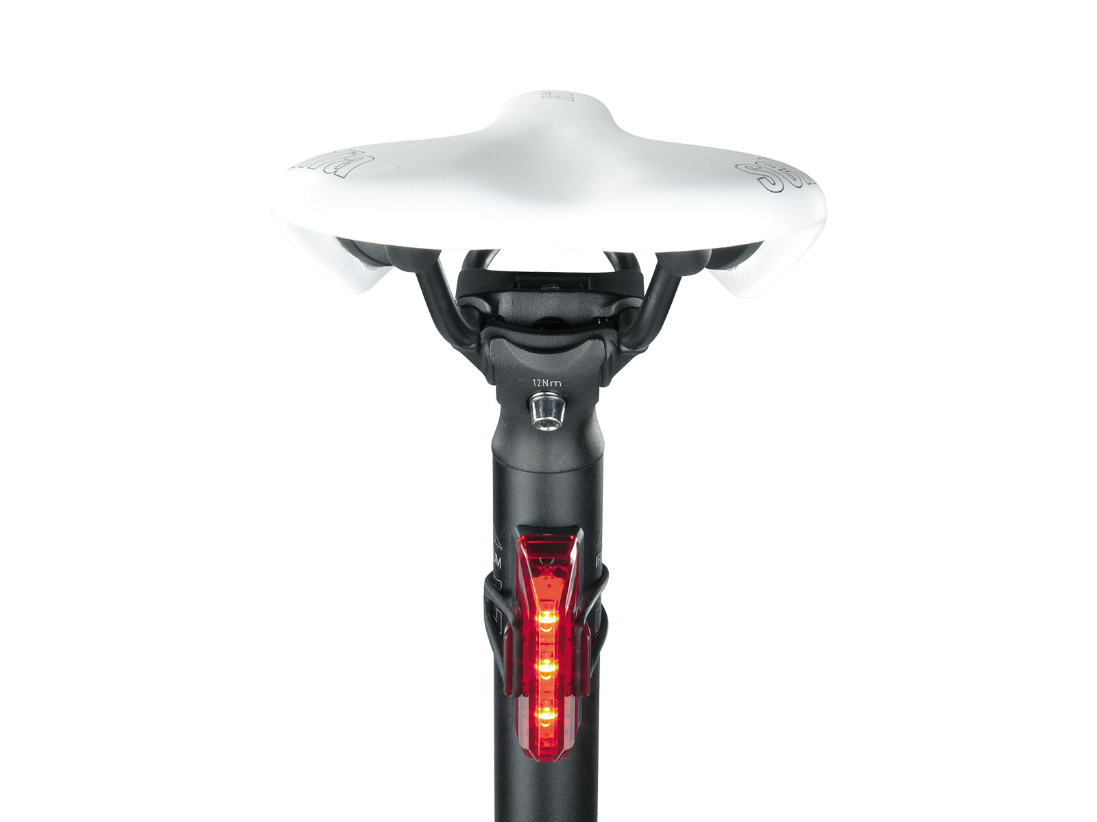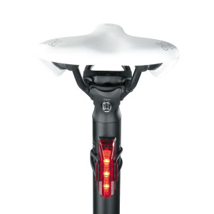Slim, aerodynamic tail light fits seatpost or seatstay perfectly. Rubber strap allows tool-free mounting/ removal and multi mounting positions.