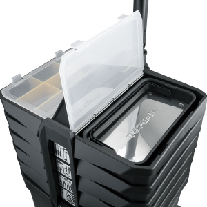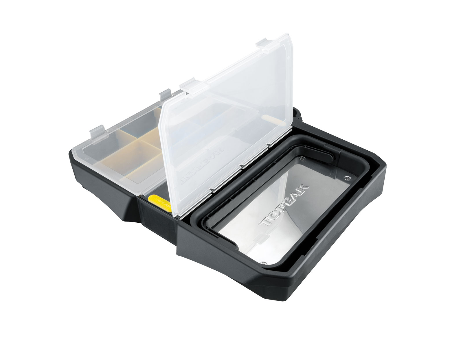 Magnetized tool tray securely holds spare metal parts. Compact size and carrying handle for added convenience.