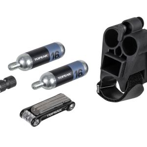 一款公路車專用補胎工具組合套件,可隨意固定於公路車架的專屬固定座,配置了AirBooster CO2氣嘴頭、兩瓶CO2氣瓶和一隻Mini 9 Pro摺疊工具,我們將公路車路上會用到的裝備全部打包於一體,方便騎士攜帶使用。