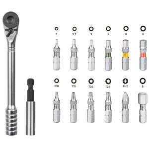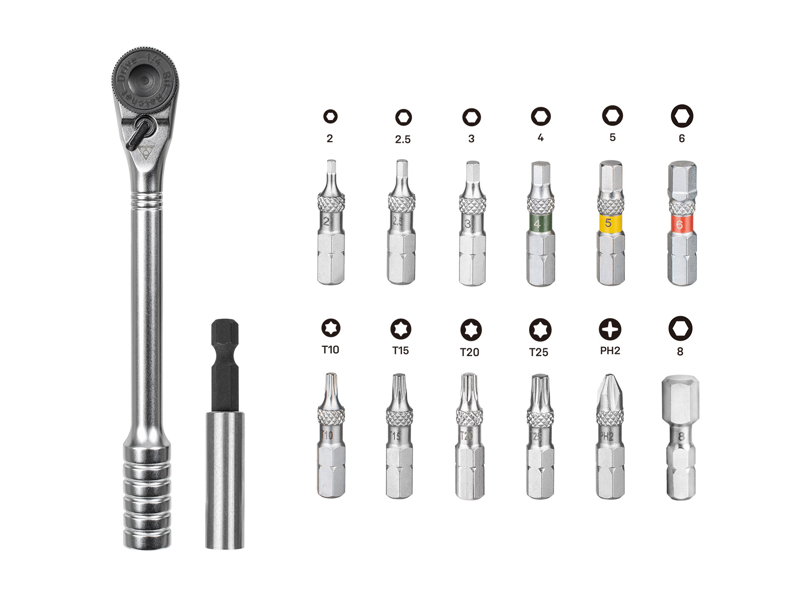 它搭載精密棘輪機構,每一次旋轉都順暢迅速,減少操作時間,提高維修效率。選用高強度鋼材,確保工具耐用可靠,即使面對高扭力需求,也能穩定應對。內含多種六角扳手、星形扳手與起子頭,可處理變速、剎車等多項調整需求,應對各種維修情境。