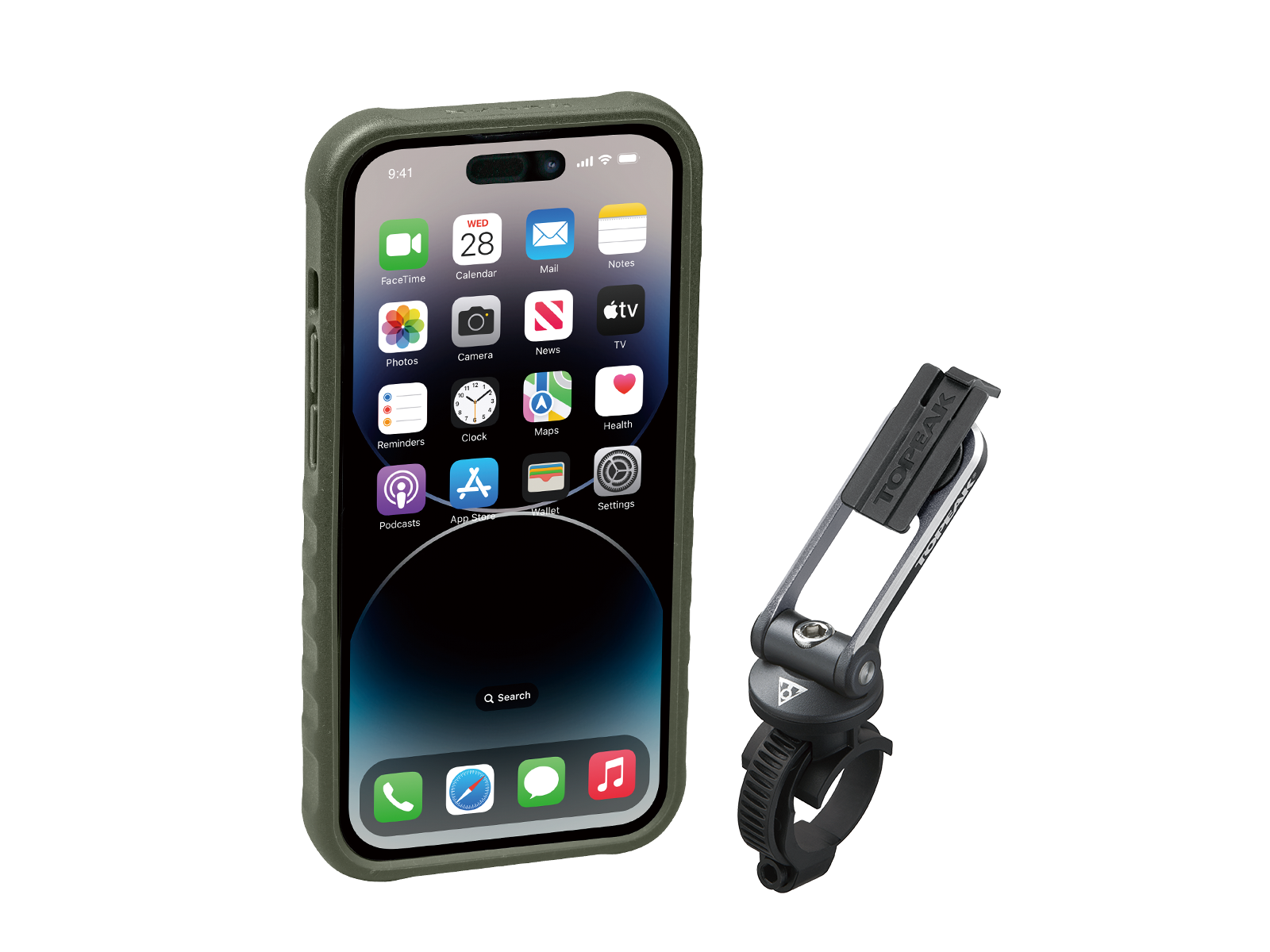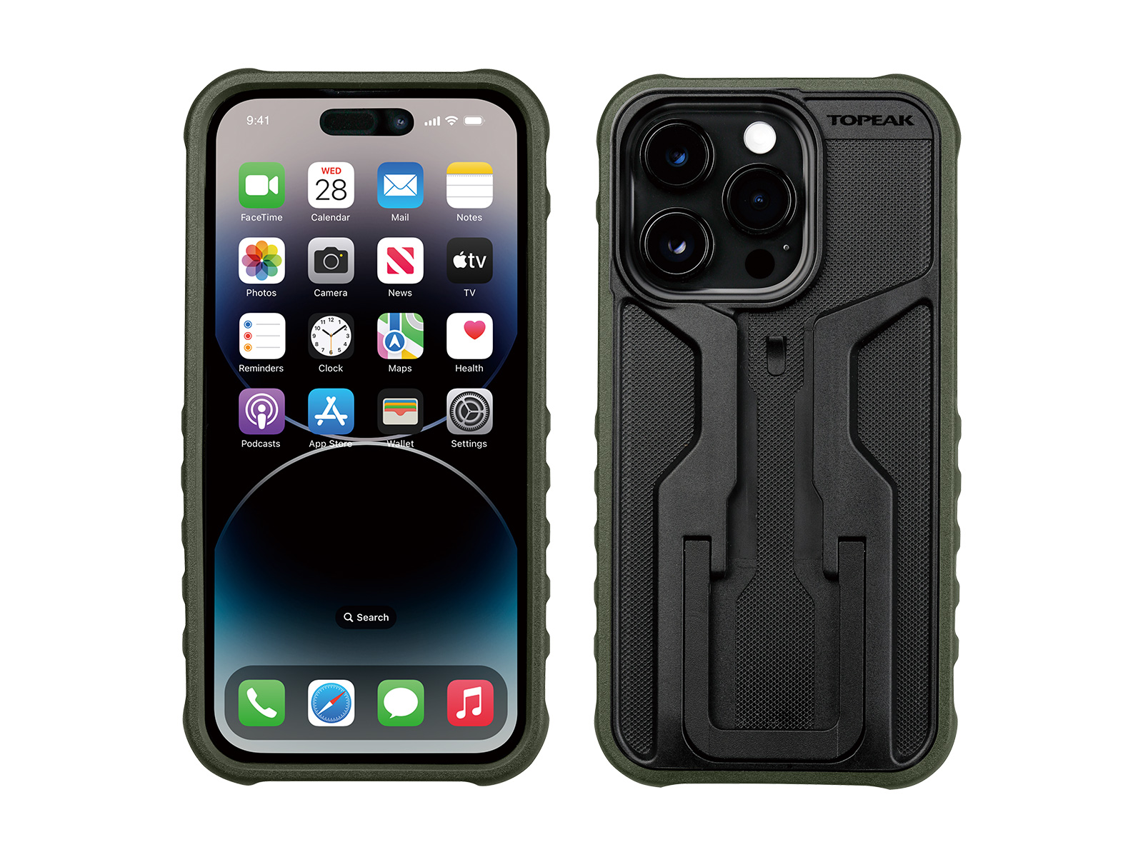 The RideCase for iPhone has a scratch-resistant, dual-density, non-slip, high-grade engineering polymer/rubber exoskeleton for shock and impact protection that holds your phone securely while on the go. Its full angle adjustment allows viewing in portrait or landscape modes and an Integrated flip stand for post-ride hands-free viewing. Compatible with Lightning cable charging.